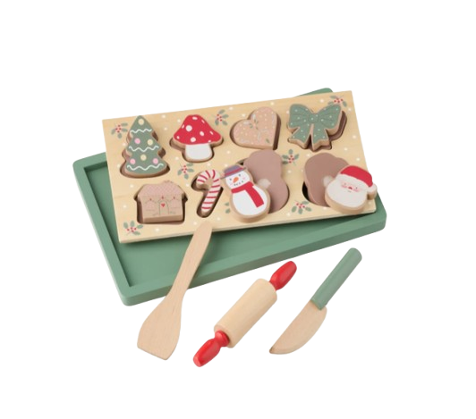 De houten kerstbakset bestaat uit acht koekjes, een bakplaat, een deegroller, een mes en een spatel, allemaal verpakt in een geschenkdoos. De items in de doos zijn gemaakt van 100% FSC®-gecertificeerd multiplex en MDF.