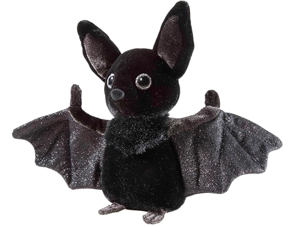 Kleine pluchen vleermuis met glinsterende vleugels en oren.