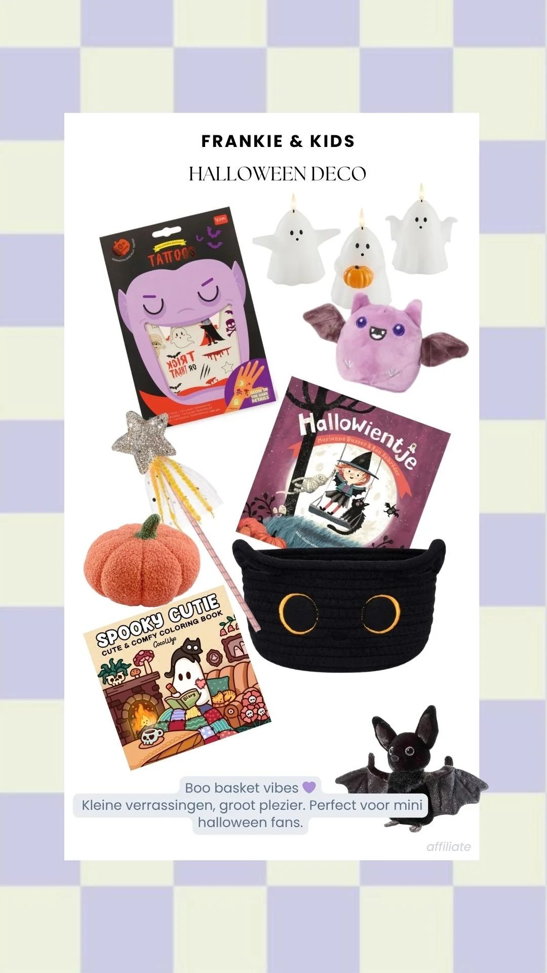 Frankie verzamelde haar favoriete Halloween-items om je te helpen zo’n vrolijke verrassing samen te stellen. Alles past perfect in de sfeer van “niet te eng, wel heel gezellig” — met items die net zo leuk zijn voor kleintjes als voor ouders die stiekem meedoen.
